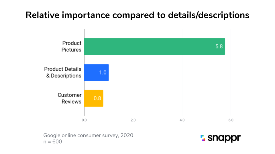 A great picture is more powerful than any other tool in the fight to convert online window shoppers. Snappr commissioned Google to conduct a consumer survey asking which information customers found most important when shopping online. This study found that product photos were deemed 5.8x more important than reading product descriptions and even 7x more important than checking customer reviews.