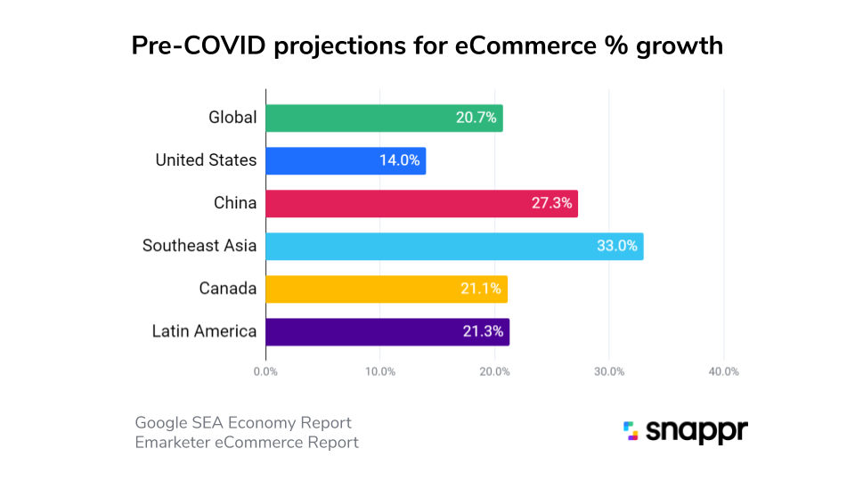 The pre-COVID-19 growth projections for online shopping in the United States was 14% YoY. This isn’t bad, but is quite low compared to the global average of 21%. US’ 14% looks even more meager when compared to the 30% projected growth in online shopping for Asian markets.