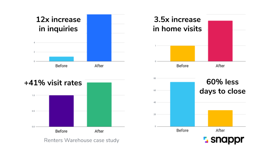 Renters Warehouse uses Snappr as their all-in-one photography solution. And since working with Snappr they have seen significant increases in inquiries and home visits, and decreases in days vacant between tenancies.