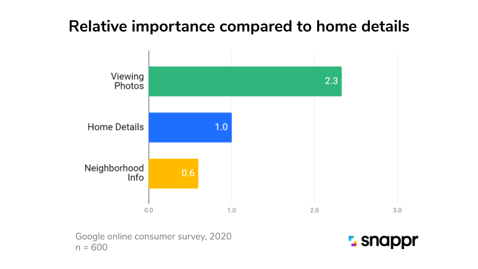 The improvement statistics might seem dramatic, but they make sense when considering how much users value images when looking at homes. Snappr commissioned a Google survey of 600 US consumers asking what information people found most useful when looking for homes and rental properties online. Photos were considered 2.3 times more important than reading descriptions and 3.9 times more important than reading information about the neighborhood. This is especially important for mobile users since it’s much easier looking at pictures vs reading through pages of text.