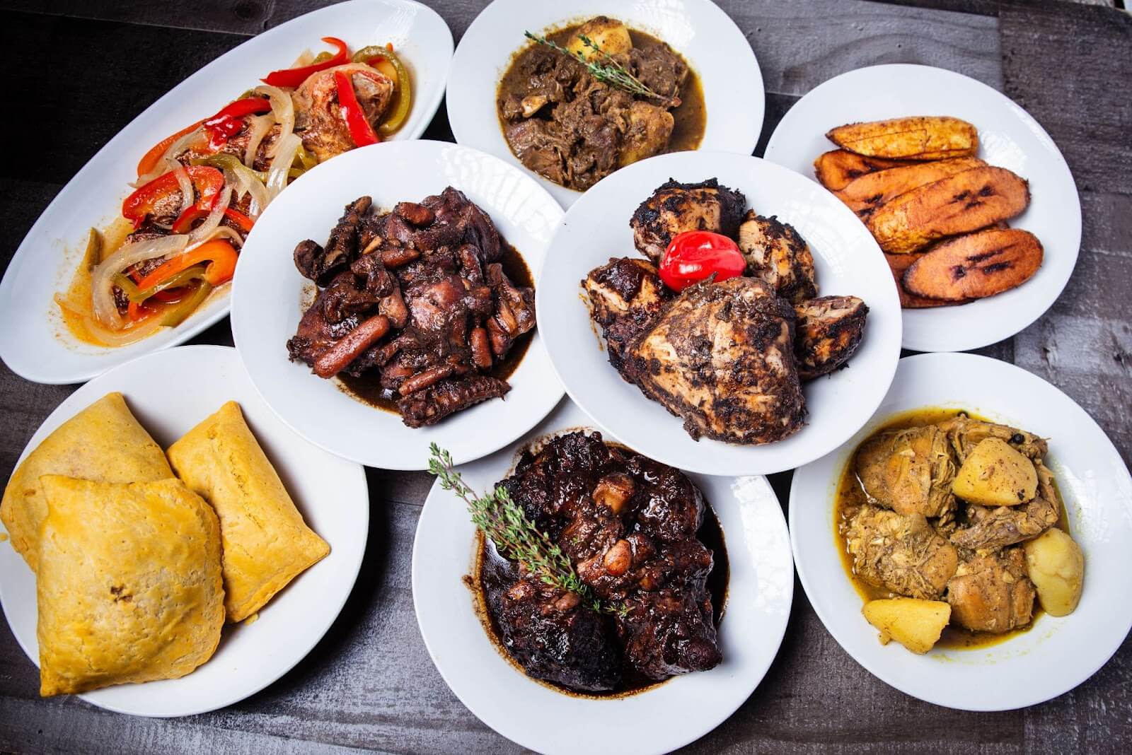 The group who queried Jamaican oxtail stew may want a package deal. They’ll see the stew at the center bottom of the photo, but also seven other dishes. In addition to a goat dish, chicken is served in various ways: classic Jamaican jerk, curried, or inside of flaky pastries to the bottom left.