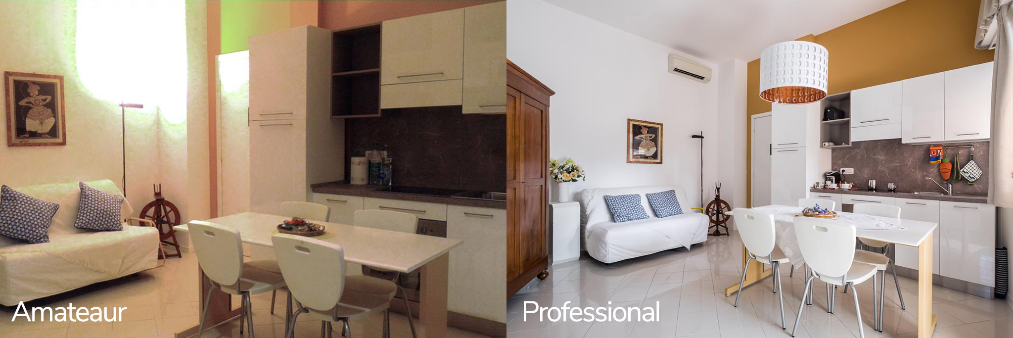 Take a look at these examples from real Airbnb listings to see how professional photography makes a drastic difference in the quality of property photos [4].