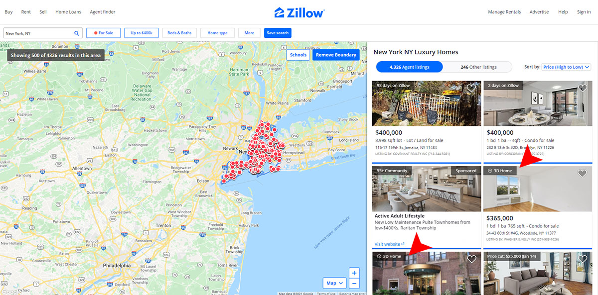 Look at these first page results on the most popular real estate search websites. What do they have in common? They all have virtual tours.