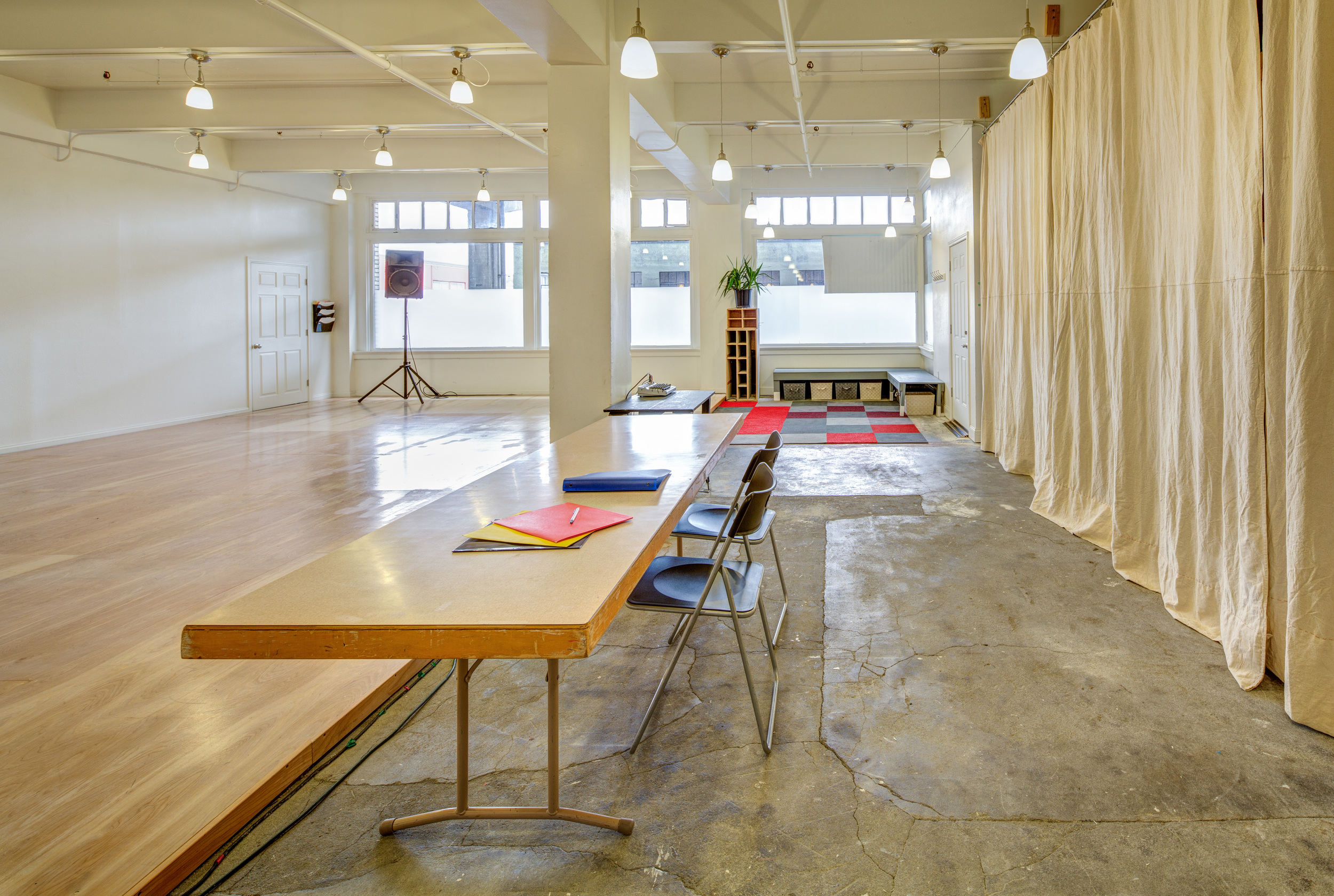 This is an hourly rental photography studio in Portland. The studio space has white ceilings, white walls, north facing windows and hardwood floors that give it an industrial feel. It's created in a way that makes it a blank canvas for creative projects. It's an inspiring space for shooting videos. The large windows provide for sufficient lighting but there is also an option to rent the lighting equipment. Some of the included features are two moving backdrop walls, two c-stands, a white seamless paper, a 6-foot wooden ladder, four modern chairs, private changing room, two wooden stools, two reflectors and two wall tapestries. Once you rent the space, it becomes private to you and your team & clients.