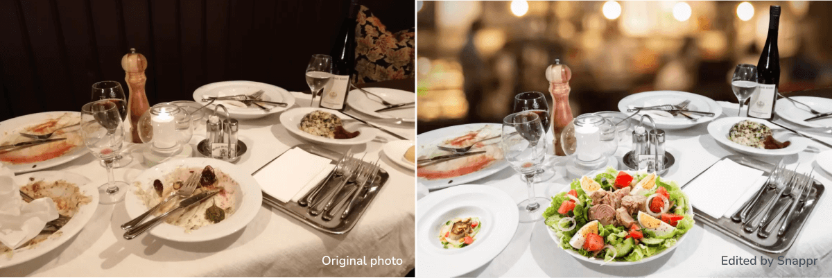 OUCH. One of our partners sent in this god-awful image to see what we could do. I’m not sure this qualifies as a food photo… more of a food murder scene, perhaps. Note what the Snappr Central Editing team did to this sad moment: nice lively background added, cleaned up the table, a fresh salad appears out of nowhere, everything looks edible… the edited image could pass muster in any dining array. Nice job, Central Editing.