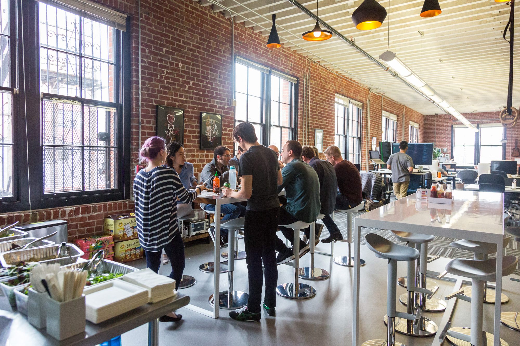 As lunchtime approaches, the space becomes a little less quiet. People wander around to trade notes about common projects, and a bit of muffled banter and laughter breaks out. People slowly make their way over to the kitchen, where a catered lunch is being served. Sergie entertains the crowd while Vlad is off in the far corner sorting out a time-sensitive issue that has just popped up.